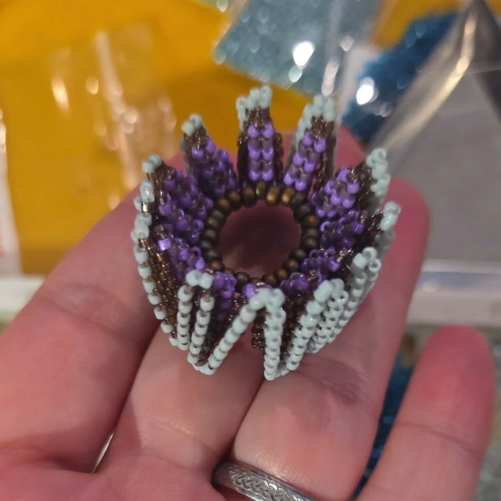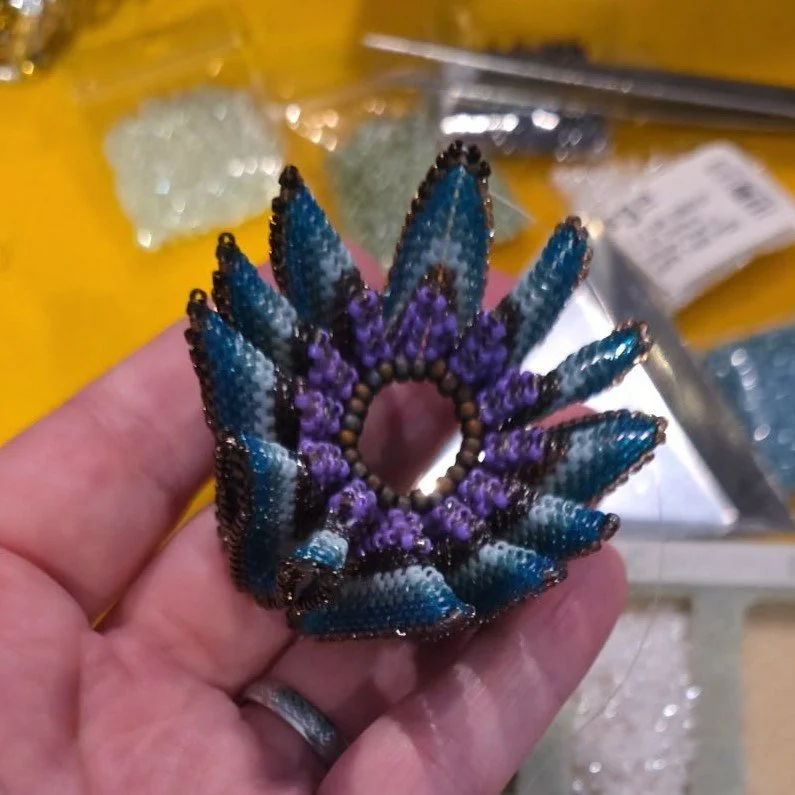 Since I started bead weaving, I’ve always been fascinated by geometric beadwork. Implausible feats with beads defying normal beadwork characteristics is a thing I’ve always wanted to try. I had a pattern I found online from another bead weaver who had a blog. And this person, whom I’d come to know as The Screamin’ Squirrel, had a geometric bead weaving pattern called The Winged Star. I’d been intimidated by the idea of learning about support pods and casting on to other objects to hold the form while I crafted it— yet somewhere along the way I gained the confidence to give it a try and this was challenge was the perfect opportunity.
